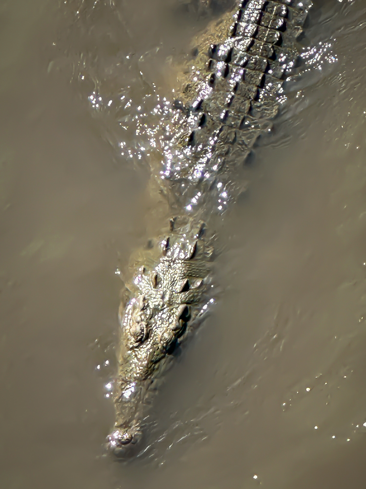 Es wird empfohlen, aus Sicherheitsgründen auf der Brücke zu bleiben und nicht näher an das Ufer oder die Krokodile heranzutreten.